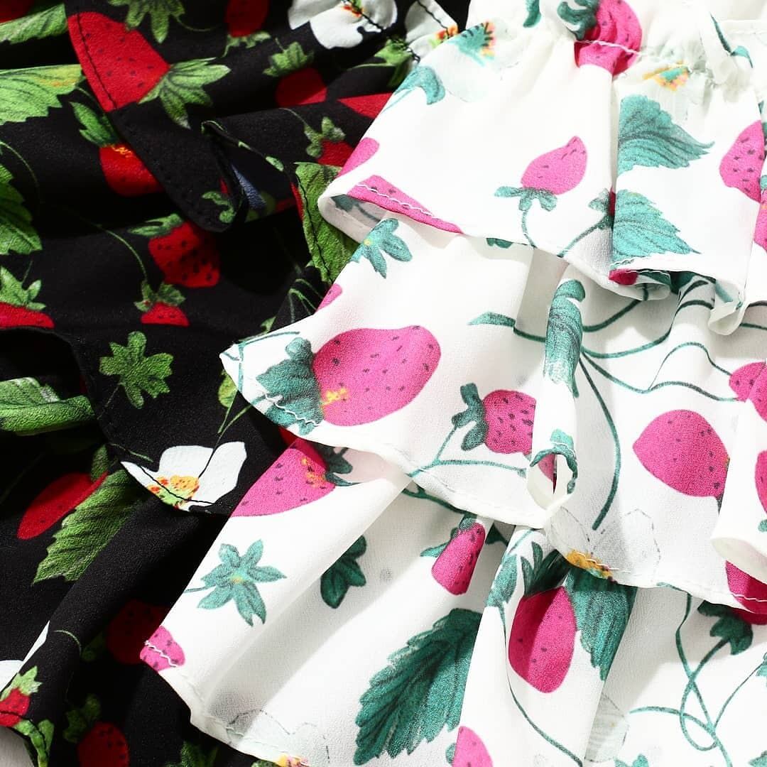 カラーコントラストが鮮やかないちご柄で、フリルたっぷりのキャミワンピを仕立てました ♪